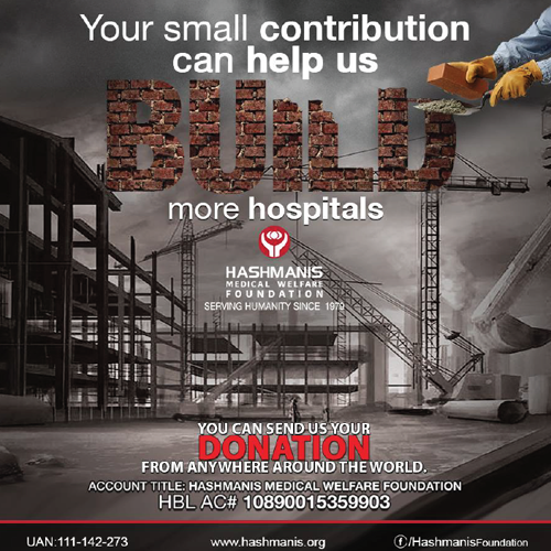 Bank Name: HABIB BANK LIMITED Account title: Hashmanis Medical Welfare Foundation Account No: 10890015359903